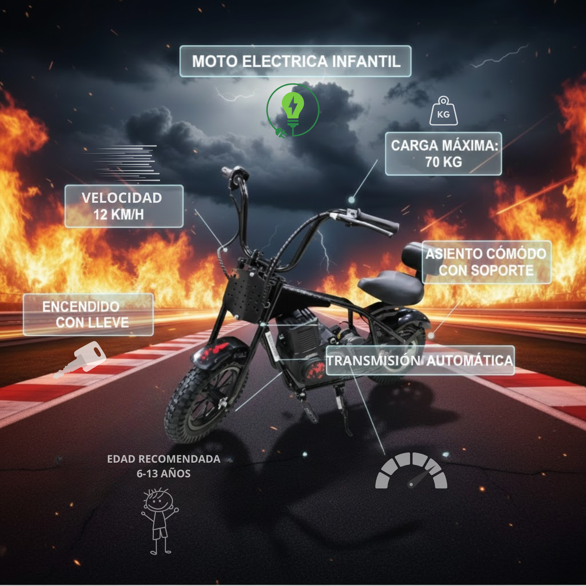 Perfecta para que los niños vivan una experiencia de conducción segura, emocionante y llena de diversión al aire libre. Este vehículo eléctrico infantil combina rendimiento, diseño y seguridad, convirtiéndose en un regalo ideal para pequeños aventureros. Con un motor de 250W, esta moto infantil alcanza una velocidad máxima de 12 km/h Su diseño robusto y resistente, con un marco de acero y neumáticos de caucho, garantiza estabilidad y absorción de impactos en cualquier terreno. Además, soporta hasta 70 kg, siendo adecuada para niños de distintas edades, haciendo cada trayecto una aventura única y memorable. Aviso legal • Edad máxima aconsejada para su uso: 12 años. • La duración de la batería depende del uso que se le dé al producto.